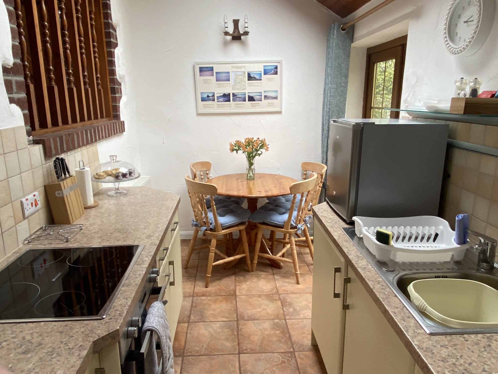 The kitchen is well equipped with a double oven, hob, fridge, freezer, microwave, kettle, and toaster. All cutlery, utensils and plates are provided. The Dining Area opens out to the patio for summer dining!